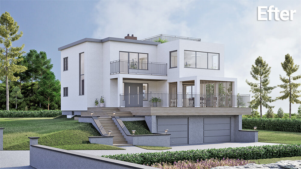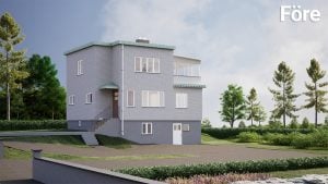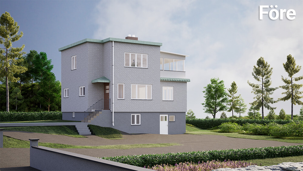 Utmaningen i projektet var att smälta ihop den befintliga byggnaden med tillbyggnaden exteriört. Resultatet blev en modern funkisstil med putsad fasad i vit/mörkgrå kulör och gråa fönster utan spröjs och foder.
