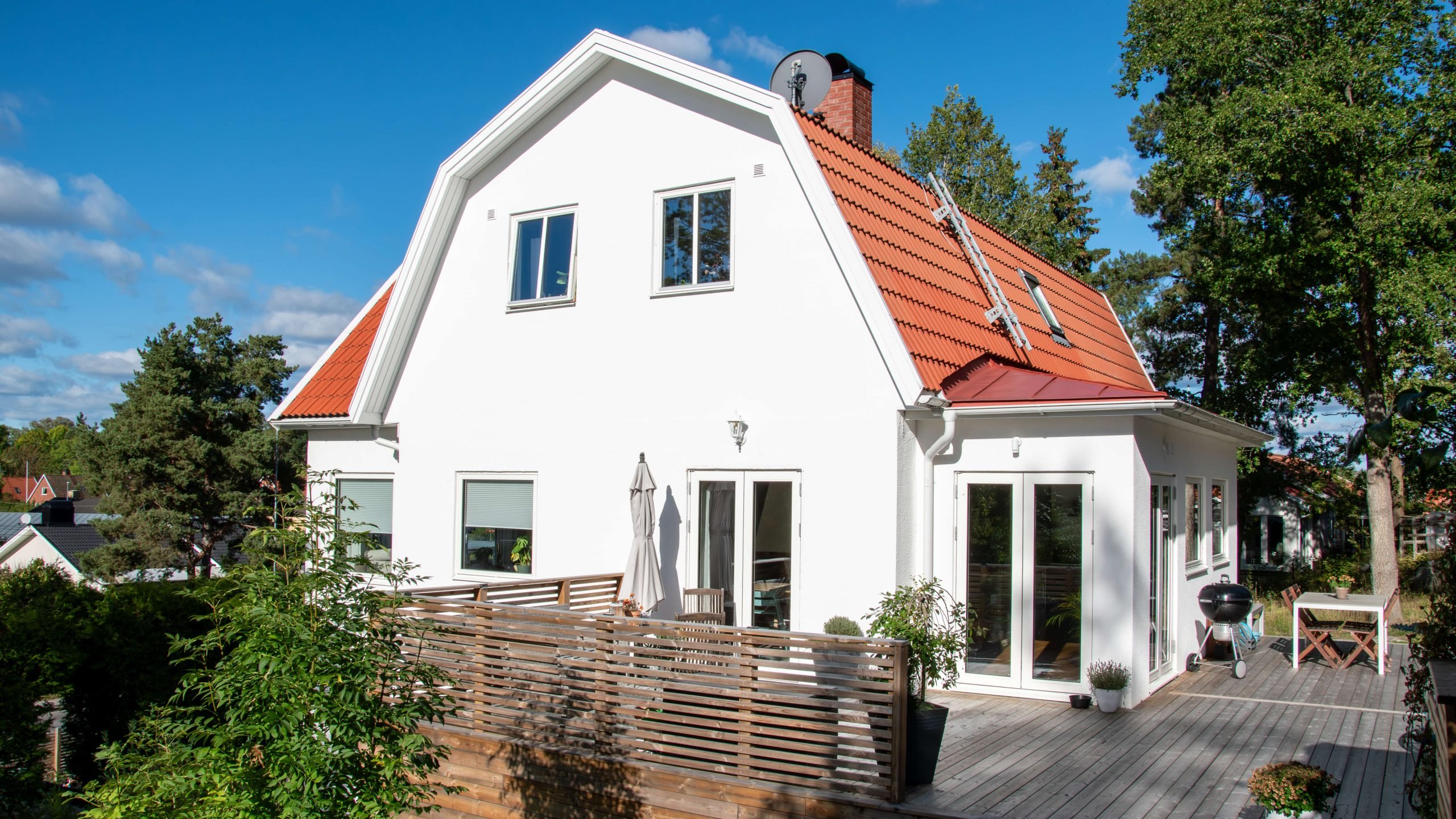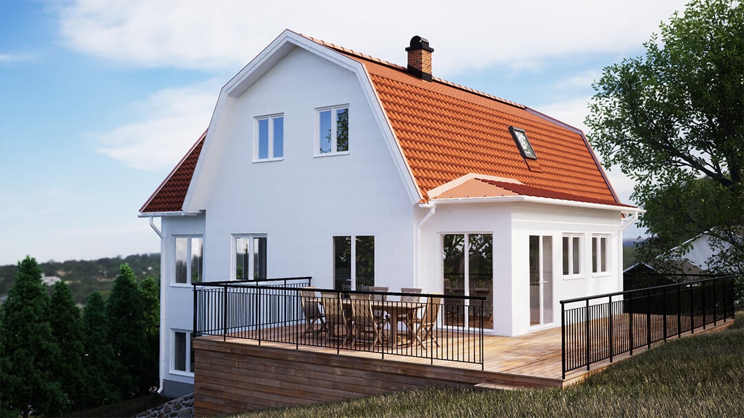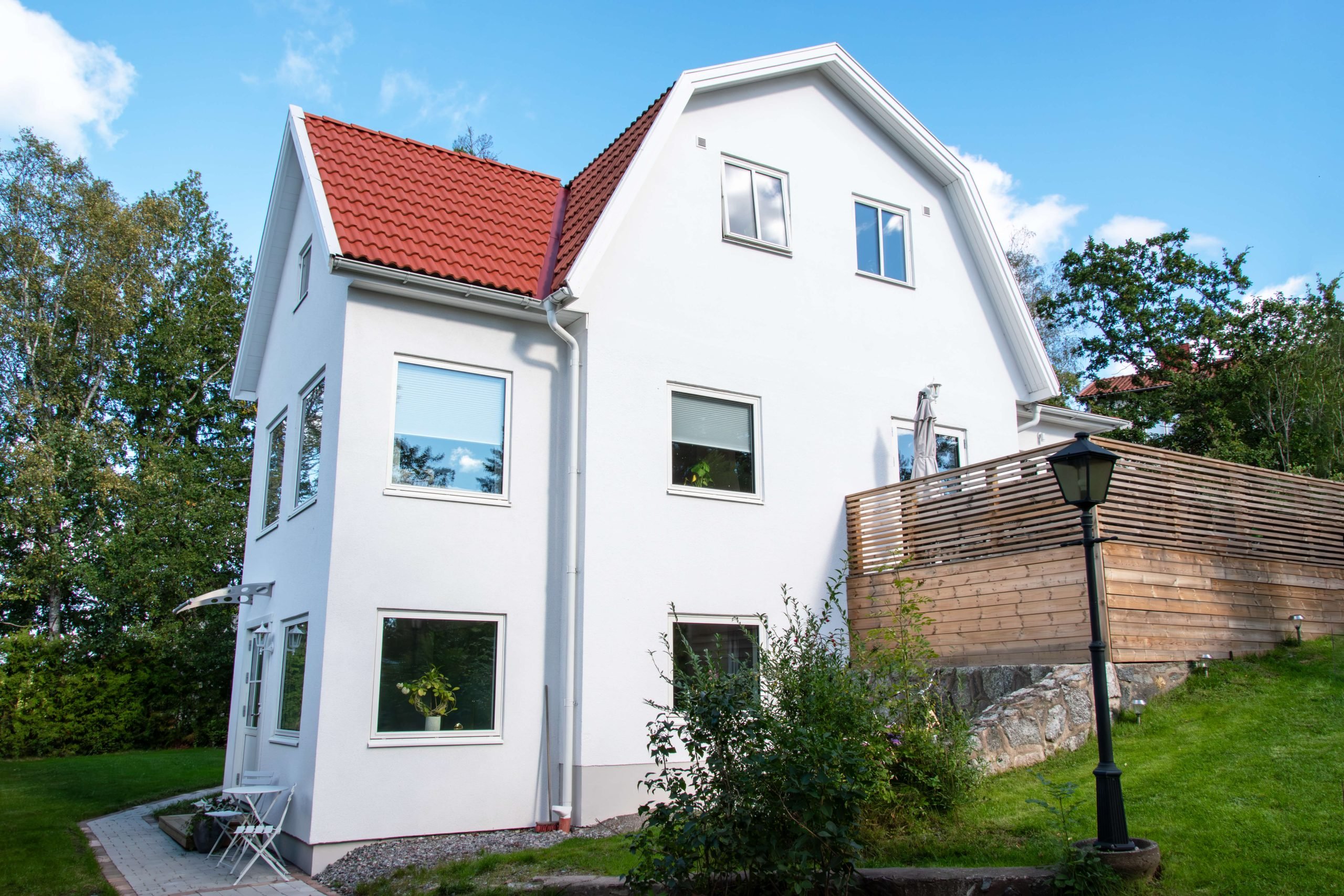 I detta projekt önskade kunden en bättre planlösning för vardagsrum och kök, men även göra en tydligare entré samt byta fasadfärg. Det befintliga huset är ett suterränghus och därför blev det naturligt med två tillbyggnationer åt vardera håll.
