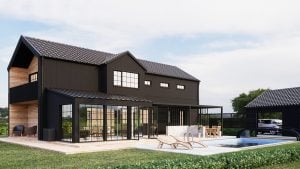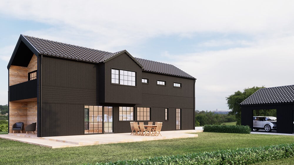 Uterummet skulle smälta in med det befintliga huset och ha ett modernt uttryck med stora glaspartier och spröjs.