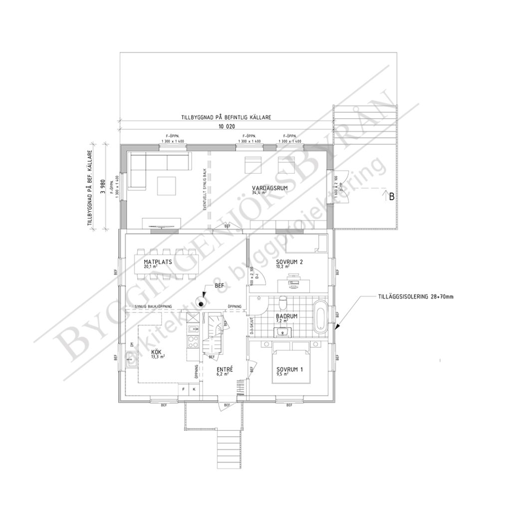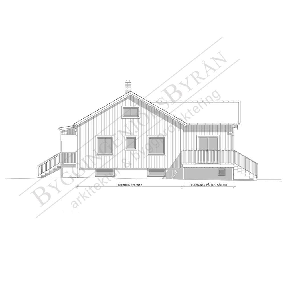 Vårt uppdrag var att ta fram ett förslag på en tillbyggnad som både uppfyllde familjens önskemål och samtidigt tog hänsyn till kommunens krav på varsamhet i området. Eftersom huset redan har en befintlig källare skulle tillbyggnaden anpassas utifrån denna, vilket också innebar att taken på den nya delen måste harmoniera med de befintliga taken. Familjen önskade större och mer öppna sociala ytor.